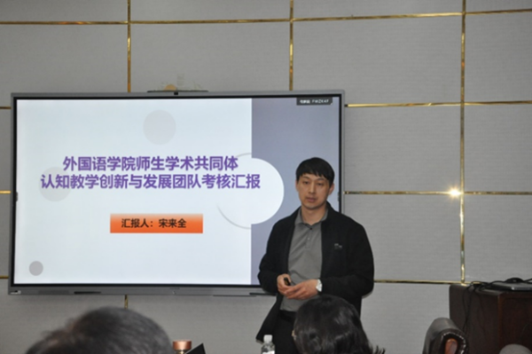 会议伊始,王卓院长介绍了第一届“师生学术共同体创新与发展团队”的六个团队,分别是毕晓毅负责的“中国教育话语传播”、胡艳玲负责的“英语课程与教学论”、宋来全负责的“认知教学创新与发展”、孙嵩霞负责的“俄语语言文学与文化”、王秀香负责的“基于《综合英语》的课程教学与研究”、翟乃海负责的“当代英语文学跨学科跨媒介研究”。六名团队负责人依次对团队基本情况进行了汇报,内容包括:团队成员组成、团队建设情况、项目成果与后期规划。