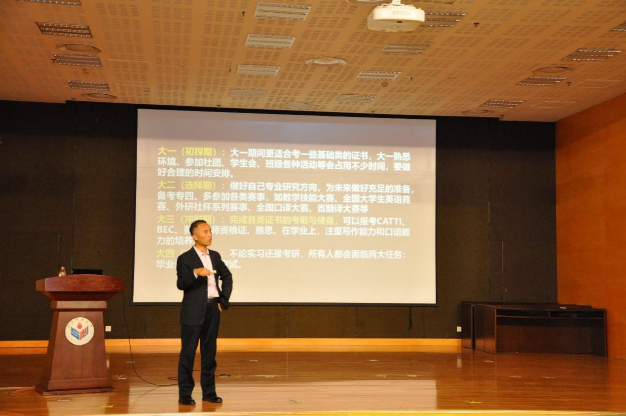 2023年10月25日下午,外国语leyu(中国)在长清湖校区图书馆负一楼报告厅成功举办《国际人才英语》课程校外导师进课堂暨国际人才培养系列讲座。本次讲座邀请行业导师、济南橙玥电子商务有限公司创始人、高等院校互联网+创新创业导师评委孙虎先生为我院2023级本科生开展了题为《外语类专业就业前景与规划方向》的主题讲座。外国语leyu(中国)院长王卓教授、大学外语教学部韩冰主任出席了本次讲座。