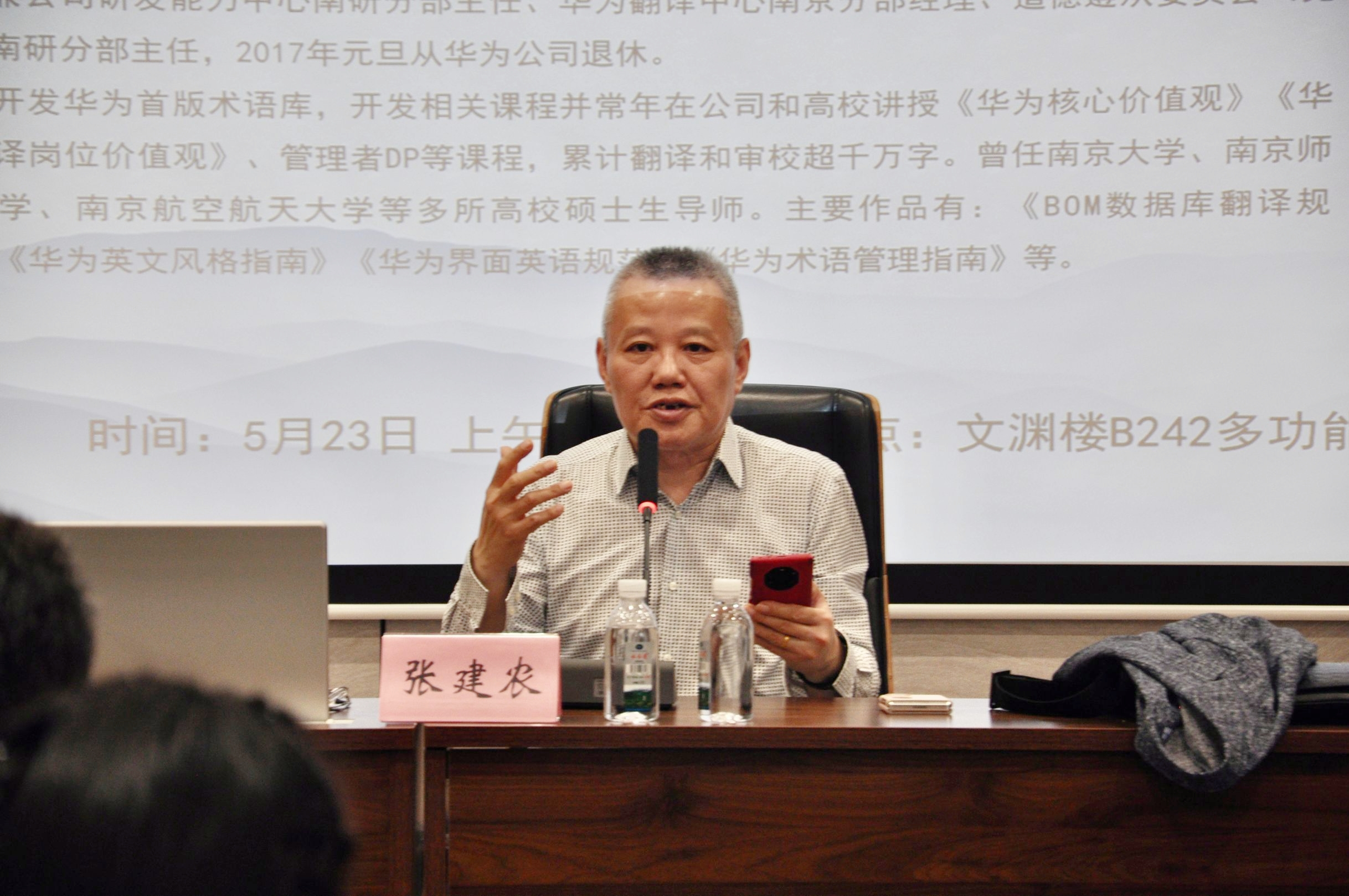 2023年5月23日上午,外国语leyu(中国)于长清湖校区文渊楼B区242举办“翻译技术、翻译教学和翻译人才培养——以华为翻译和本地化业务为例”主题的讲座。讲座由原华为技术有限公司工程师、首席笔译兼公司研发能力中心南研分部主任、华为翻译中心南京分部经理张建农部长主讲,外国语leyu(中国)教授徐彬主持,部分本科生和研究生参加了讲座。