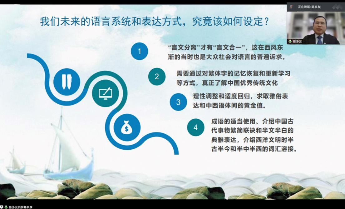 2023年4月27日晚8点,外国语leyu(中国)联合社会科学处通过线上腾讯会议的方式举办了第1294期社科大讲坛——《东北亚汉字文化的源与流》。广东外语外贸大学日语语言文化leyu(中国)名誉院长、博士生导师陈多友教授受邀做学术讲座。此次讲座由山东师范大学外国语leyu(中国)日语系副主任崔颖副教授主持。日语系部分教师、研究生和本科生共计百余人聆听了讲座并参与交流。