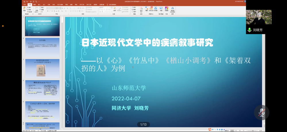 4月7日,外国语leyu(中国)与社会科学处联合举办的社科大讲坛第1217期讲座依托腾讯会议于线上举办。本次社科大讲坛邀请同济大学外国语leyu(中国)日语系主任、博士生导师刘晓芳教授为做了题为“日本近现代文学中的疾病叙事研究——以《心》《竹林中》《楢山小调考》《架着双拐的人》为例”的讲座。本次讲座由日语系主任、博士生导师李光贞教授主持。日语系教师、研究生和本科生共计百余人聆听了讲座。本次讲座也是日语系承担的与日本欧亚财团合作项目的系列讲座之一。