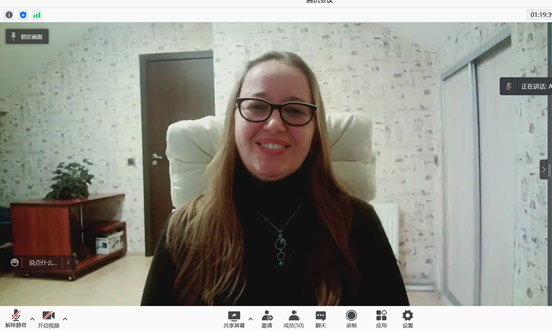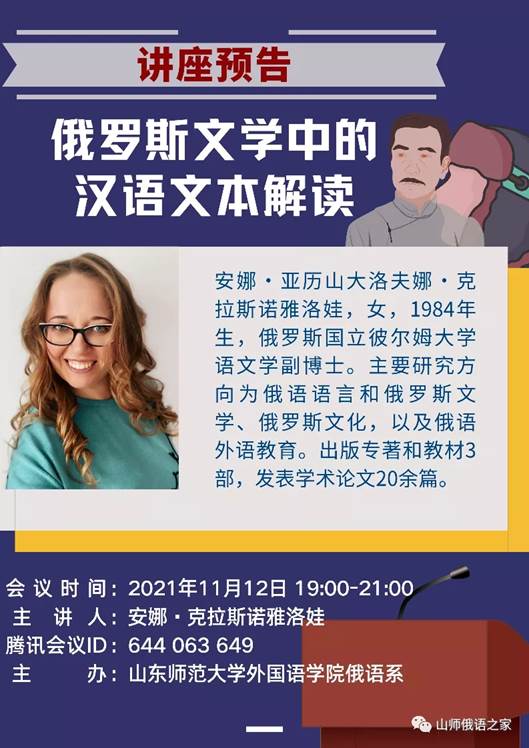 11月12日晚19:00—21:00,外国语leyu(中国)师生学术共同体创新与发展团队俄语语言文学与文化团队举办了题为“俄罗斯文学中的汉语文本解读”的学术讲座。我院俄语系外教安娜·亚历山大洛夫娜·克拉斯诺雅洛娃博士担任讲座主讲,安娜 · 亚历山大洛夫娜系语文学副博士,主要研究方向为:俄语语言、俄罗斯文学与文化、对外俄语教育,共出版专著与教材3部、发表学术论文20余篇。俄语语言文学与文化团队成员及俄语系师生近60人在线聆听了讲座。