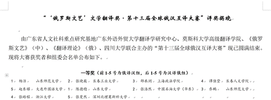 近日,“‘俄罗斯文艺’文学翻译奖·第十三届全球俄汉互译大赛”公布了评奖结果。我院报名参赛的俄语系杨洁副教授和2020级硕士研究生乔鹏同学双双斩获一等奖。