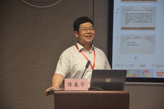 在下午的讲坛中,战略支援部队信息工程大学陈春华教授作了题为“英语视听说课程与课程思政”的报告。陈春华教授从视听说课程,视听说课程思政两方面出发进行介绍。作为《英语类专业本科教学指南》中规定的英语专业核心课程,英语视听说课程在英语专业人才培养过程中发挥着重要作用。陈春华教授分享了自己对于视听说课程的教学目的的思考,他认为视听说课程要充分利用课程内容鲜活、呈现方式多样、跨文化对比资源丰富的优势。教师要用开放的胸怀和眼界来传授知识,结合各个学校的办学育人目标和定位,根据课程特点,坚持价值塑造、知识传授和能力培养相结合,有效融入课程思政。最后,陈教授强调要在课程中锻炼思辨能力,增强学生跨文化意识,为培养高素质英语专业人才服务。