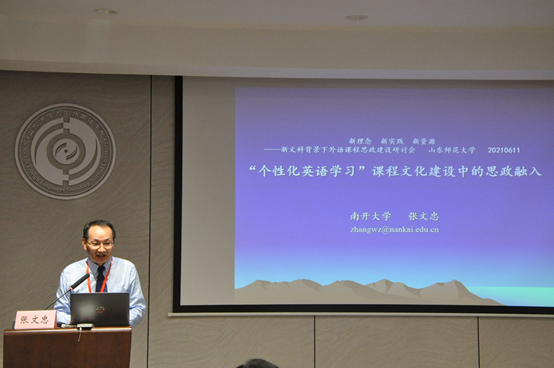 南开大学张文忠教授的报告主题是“‘个性化英语学习’课程文化建设中的思政融入”。张文忠教授从报告的题目出发,结合南开大学的课程实践,介绍了南开大学外国语leyu(中国)“个性化英语学习”选修课程的文化建设创新实践及思政融入课程文化建设的做法。“个性化英语学习”课程旨在通过教师引导,实施一系列学习任务和课堂角色,在这一过程中强调合作学习。张文忠教授提到,课程文化就是一种实践共同体文化,课程文化建设连通思政。课程中的每位参与者都是课程实践共同体的一份子,遵循全人教育理念和赋权增能原则,张教授认为课程文化自动包含了诸多思政元素,课程文化建设即为课程思政,立德树人的思政无处不在。张文忠教授最后提到,在这种课程实践共同体文化中,课程文化是用来浸润的,外语思政需润物无声,育人于细节。