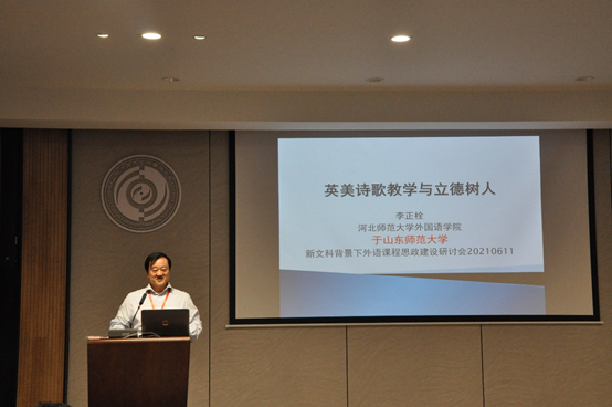 河北师范大学李正栓教授以“英美诗歌教学与立德树人”为题,首先介绍了诗歌的教诲功能、愉悦功能和感动功能。他提到,作为教师要注重教师育人,挖掘诗歌思政内涵,培养德才兼备的人才。通过翻译欣赏诗歌,培养学生对祖国语言的热爱与文化自豪和自信。李教授还提出,歌即诗,诗即歌;在比较当中学习;让学生学习评论和提问;鼓励学生仿写和创作等理念方法,他认为诗歌讲解应该通过讲解、比较、对比、翻译、创意写作、互动等手段使学生潜移默化的融入课堂,在润物细无声中感受到学习诗歌的愉悦并进行双向学习和跨文化思考。