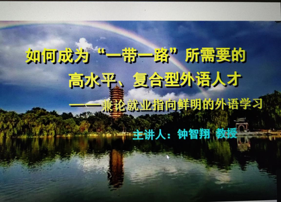 接下来,钟教授指出了我国与“一带一路”沿线国家的合作领域十分广泛的现状,并分析了“一带一路”建设的4种需求。钟教授提出,据分析,“一带一路”建设大致有4种需求:(1)政府间人文交流需求;(2)项目决策与谈判需求;(3)项目落地国外需求;(4)项目落地国内需求。他举例优果华通国际(泰国)有限公司的岗位招聘要求,指出“一带一路”对外语人才的需求已逐步从“精通外语”向“一专多能”、“多专多能”转变。尤其是通晓多种领域知识的高素质、综合型外语人才更是备受企业青睐。这表明除外语外,学生还应掌握其他学科,如经贸、旅游、法学、工程技术等行业的知识,成为具备“外语➕技术➕专业”的复合型人才。