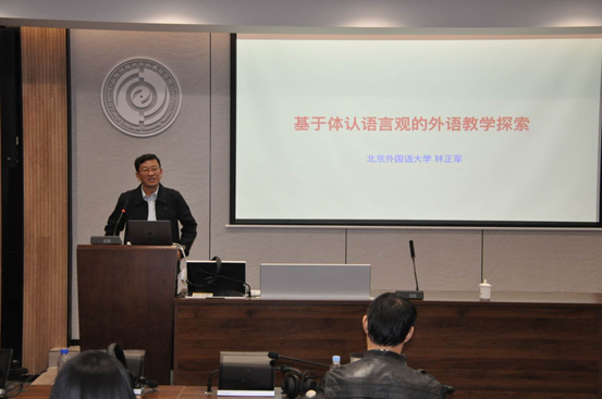 其次,林教授讲解了经典语言观对外语教学的影响,包括结构主义语言观、Chomsky语言观、社会功能语言观对外语教学的影响。随后林教授讲述了体认语言观的缘起与概念。他指出,在20世纪70年代,随着认知科学的发展,人们认为人的心智来自于体验,由此基于心智的体验性为语言学研究注入了新活力,形成了“体认语言观”。林教授重点谈到了体认语言观指导下的外语教学理念和外语教学原则、内容与目标,以限定动词+非限定动词,语言表达式转换和使用的理据两个实例向我们充分展示了如何将体认语言观与外语教学相结合。