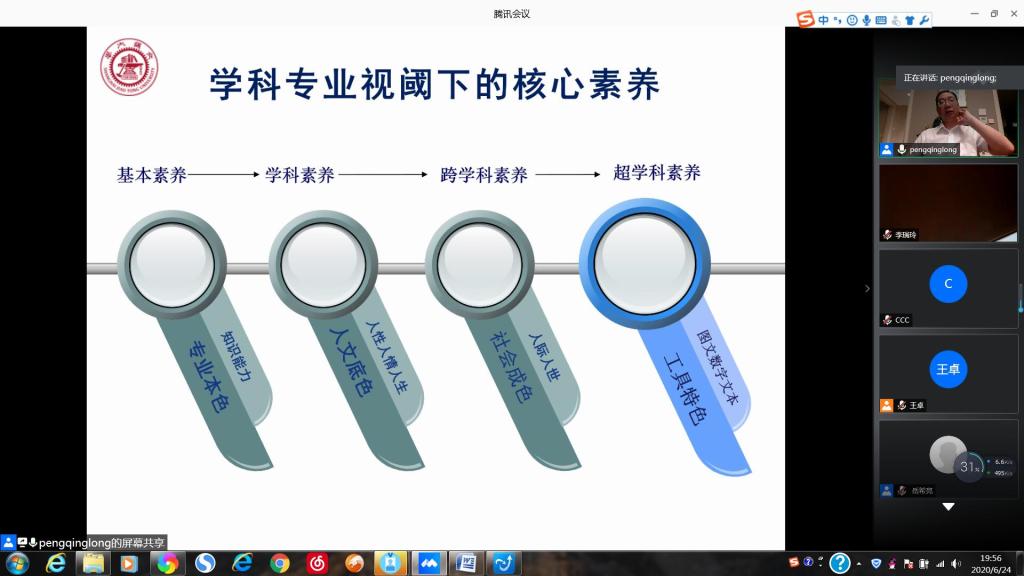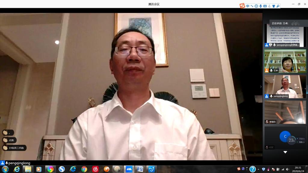 6月24日晚,外国语leyu(中国)联合社会科学处主办的“庆祝山东师范大学建校七十周年系列学术活动”之“社科大讲坛”第997期依托腾讯会议平台顺利举办。讲坛特邀上海交通大学彭青龙教授作了题为“新文科建设与外语学科转型发展”的讲座。本次讲座由外国语leyu(中国)院长王卓教授主持,外国语leyu(中国)全体领导班子成员、各学位点负责人、学科骨干教师、部分研究生和本科生200余人聆听了此次讲座。
