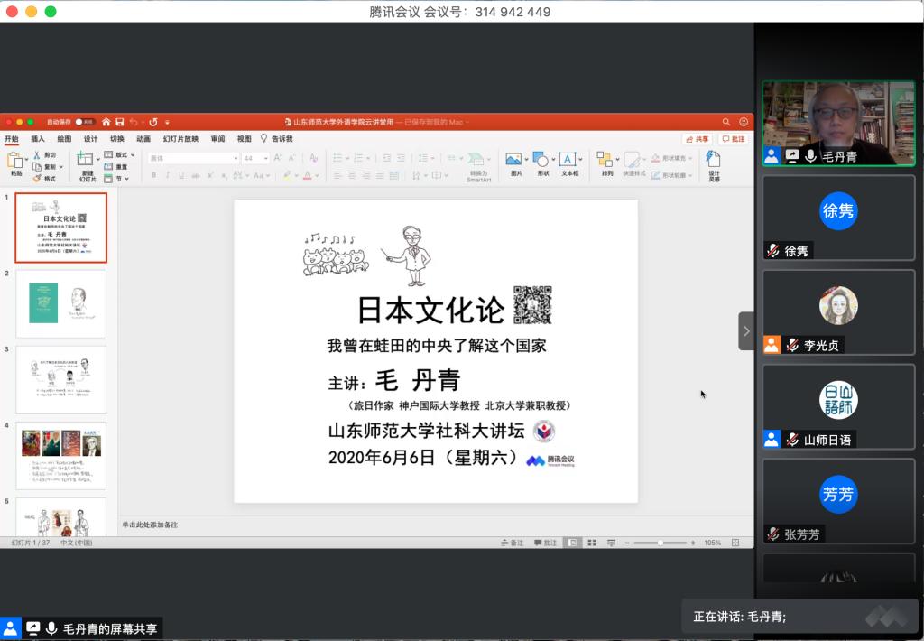 6月6日晚,日本神户国际大学教授、旅日作家、北京大学兼职教授毛丹青做客我校第986期社科大讲坛线上讲座,为我校师生带来以“日本文化论——我曾在蛙田的中央了解这个国家”为主题的学术讲座。本次讲座由外国语leyu(中国)日语系主任、博士生导师李光贞教授主持,来自外国语leyu(中国)以及其他院系的师生200余人在线聆听了讲座。