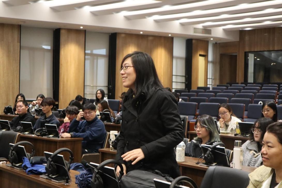 在互动环节,现场师生与王斌华教授进行了深入的学术交流。英语系杨彬副教授就业界普遍关注的中国文学典籍外译问题与王教授交换了看法。王教授结合自身的翻译实践与教学经验,分享了处理文化负载词与历史语境的策略,为在场的师生带来了新的研究启发。刘焱老师则就研究中的数据整理与语料库文本分析技术提出了具体问题,王教授结合“知行合一”的理念与当前的技术发展,介绍了前沿的研究方法。