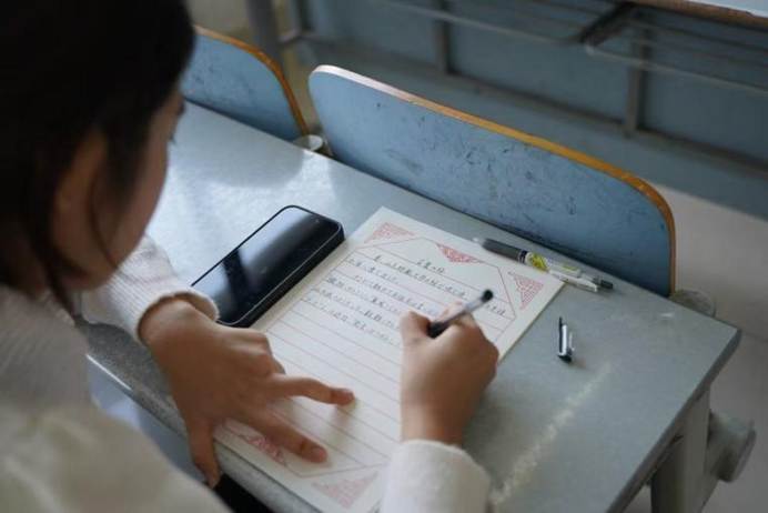软笔宣纸轻展,墨香氤氲满室。提笔蘸墨时,笔尖轻触纸面,或藏锋蓄力,或提按转折。同学们于撇捺舒展间传承中华文脉,在横折顿挫中体悟书法艺术的沉厚韵味。