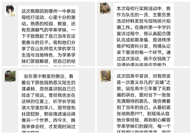 寒假期间,知行宣讲团走进德州一中,与学弟学妹面对面交流;张馨雨团队前往泰安实验中学,为近三百名高三学子解读招生政策、分享文科备考经验;巩兴语回到母校教室,细致解答专业选择、大学生活等疑问;苏宇涵等组成的宣讲队走进菏泽一中,分享成长心得与高考祝福。