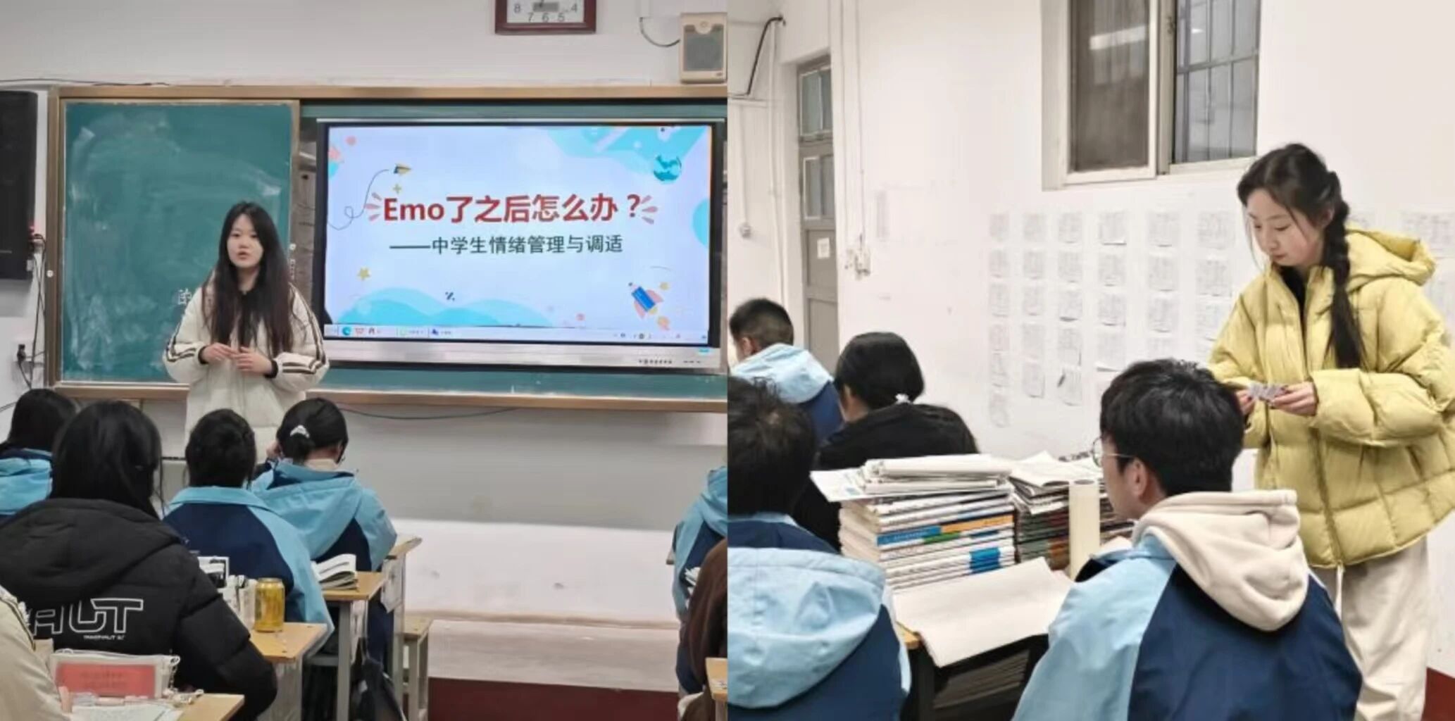 2月3日,山东师范大学“守护成长”心理护航实践团队在指导老师带领下,走进潍坊市高密市向阳中学。活动期间,学校陈校长、市教育局心理科主任及13位名师全程陪同指导。团队深入初一、初三课堂,通过“情绪接力”、“情绪小偷”等趣味心理游戏,引导学生主动表达、情景演绎与互动分享。在轻松愉悦的参与过程中,同学们不仅认识了情绪、学会了调节方法,更有效普及了心理健康知识,切实提升了情绪管理能力。